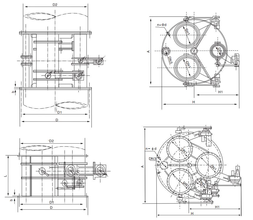 型號(hào) | D | D1 | L | b | n-Φd | A | A1 | Η | H1 | 閥門配制 | 許用流量(m3/h) | 重量(kg) | 對(duì)應(yīng) 管道 |